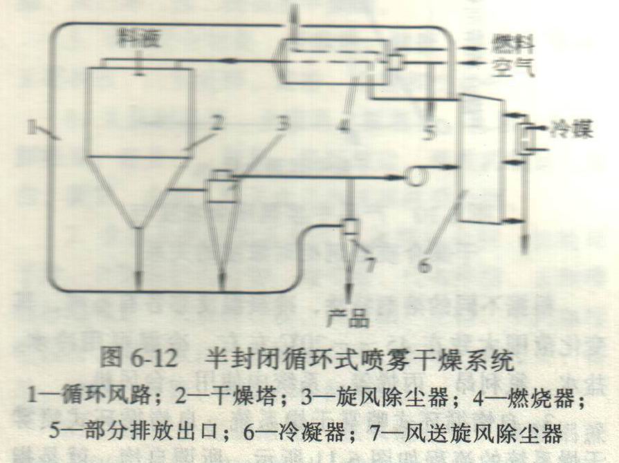 (噴霧干燥機(jī))半封閉循環(huán)系統(tǒng),一般用于以水作為懸浮介質(zhì)的物料,如單細(xì)胞蛋白、酵母、菌絲體等料液的干燥。這種系統(tǒng)從本質(zhì)上來看仍然像封閉循環(huán)式干燥系統(tǒng),在回路中仍串聯(lián)冷凝劑除濕。當(dāng)臭氣發(fā)生燃燒時(shí)也會(huì)增加系統(tǒng)的壓力,因此同樣設(shè)有一個(gè)壓力平衡裝置。半封閉循環(huán)和自惰封閉循環(huán)結(jié)合起來使用,可擴(kuò)大應(yīng)用范圍,且可節(jié)約熱能。