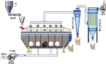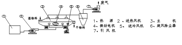振動(dòng)流化床干燥機(jī)是由振動(dòng)電機(jī)產(chǎn)生的激振力使干燥機(jī)振動(dòng),物料在一定方向的激振力的作用下跳躍前進(jìn),同時(shí)從干燥機(jī)底部輸入的熱風(fēng)使物料處于流化狀態(tài),物料顆粒與熱風(fēng)充分接觸,進(jìn)行劇烈的傳熱傳質(zhì)過(guò)程,此時(shí)熱效率最高,上腔處于微負(fù)壓狀態(tài),濕空氣由引風(fēng)機(jī)引出,干物料由排料口連續(xù)排出,從而達(dá)到理想的干燥效果。若從振動(dòng)流化床底部鼓入冷空氣或濕空氣,可達(dá)到冷卻、增濕作用。其原理示意圖如下: