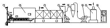 1、上煤機(jī) 2、燃燒爐 3、換熱器 4、送風(fēng)機(jī)5、除灰除塵器 6、煙氣引風(fēng)機(jī) 7、水膜除塵器 8、電控柜